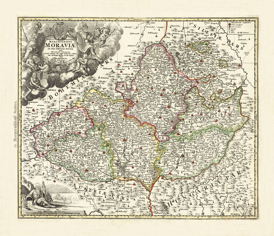 Tabula Generalis marchionatus Moraviae in sex circulos divisa quos Mandato Caesareo accurate emensus hac mappa delineatus exhibet Joh. Christoph Müller, S. C. M. Capitan , Cum Privilegio Sac. Caes. Maj.