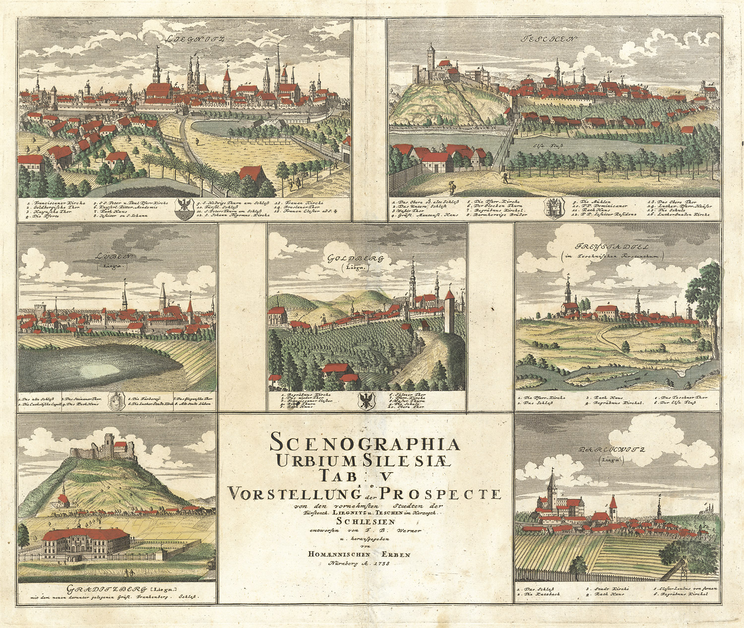 Veduty měst: Lehnice, Těšín (ČR – Polsko), Lubin, Złotoryja, Fryštát (Karviná, ČR), Grodziec, Prochovice